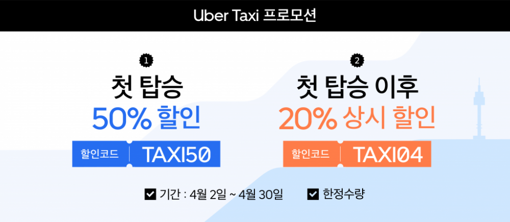 우버택시(Uber Taxi) 출시 기념으로 첫 탑승에 한해 4월 30일까지 50% 할인된 가격으로 택시를 이용하실 수 있습니다. 이벤트를 실시 한다. 할인 코드를 등록하고 우버택시(Uber Taxi) 이용시 최대 5,000원까지 할인 받을 수 있으며, 한정수량으로 조기 종료될 수 있다.