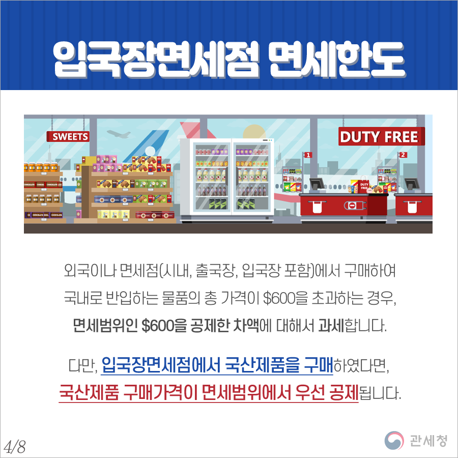 여행자 휴대에 대한 면세는 미화 600달러가 한도 이며, 입국장 면세점에서 판매되는 국산제품 구매 시 면세범위에서 우선 공제된다.
