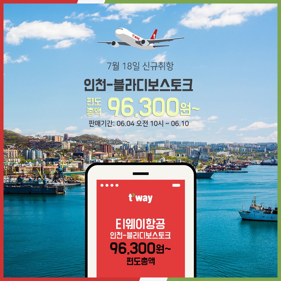 티웨이항공(twayair)은 7월 18일부터 10월 5일까지 운항하는 인천~블라디보스톡 부정기편을 주 4회 운항한다. 현재 티웨이항공은 대구~블라디보스톡을 주 4회 운항하고 있다.