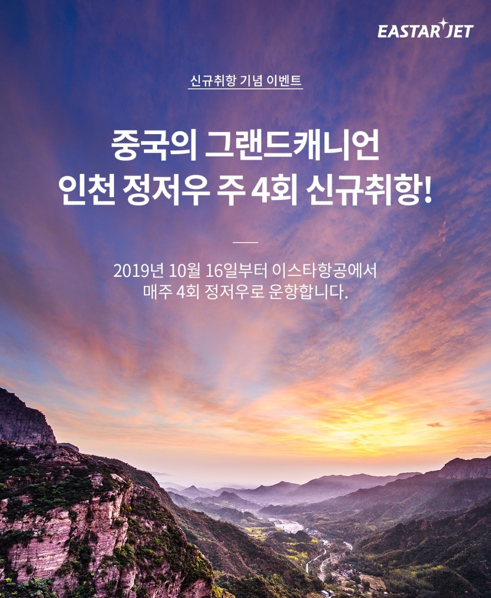 먼저 10월 16일부터 인천~정저우 노선을 주 4회(월/수/금/일) 운항한다. 정저우 노선에 이어 오는 10월 17일에는 청주에서 출발하는 장가계(주 2회)노선을 19일에는 하이커우(주 2회) 노선에 신규 취항한다.