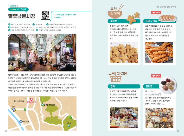 서울 전통시장 관광안내서는 관광명소로 유명한 전통시장 일부만 다루던 기존 안내서와 달리, 국내 최초로 서울 전역에 위치한 전통시장을 다룬 가이드북이다.