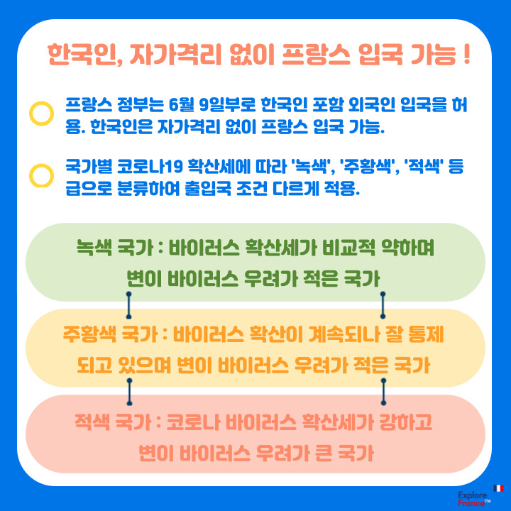 한국을 포함한 녹색 국가에서 온 여행객들은 6월 9일부터 백신 접종 여부와 상관없이 프랑스 입국이 가능하다. 자가격리 조치에서도 제외된다.