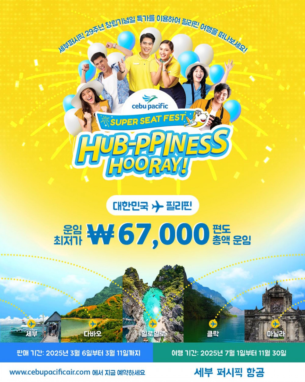 세부퍼시픽항공(Cebu Pacific Air)이 창립 29주년을 맞아, 3월 6일부터 11일까지 전 노선 특가를 진행한다.