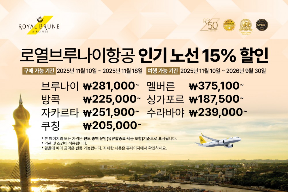 로열브루나이항공(Royal Brunei Airlines)은 오늘부터 11월 18일까지 인기 노선을 대상으로 15% 할인 특가 항공권을 판매한다. 여행 가능 기간은 2025년 11월 10일부터 2026년 9월 30일까지로 내년 설 연휴나 여름 휴가를 미리 계획할 수 있다.