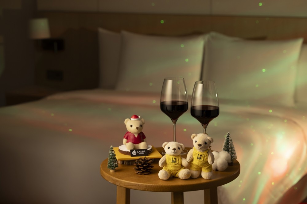 윈터 오로라 패키지에는 객실 1박과 비스타 2인 조식, 카시아 속초의 마스코트 시아(SIA) 모양의 미니 케이크, 하우스 레드 와인 1병이 포함되어 연말 감성으로 가득한 하루를 완성한다.