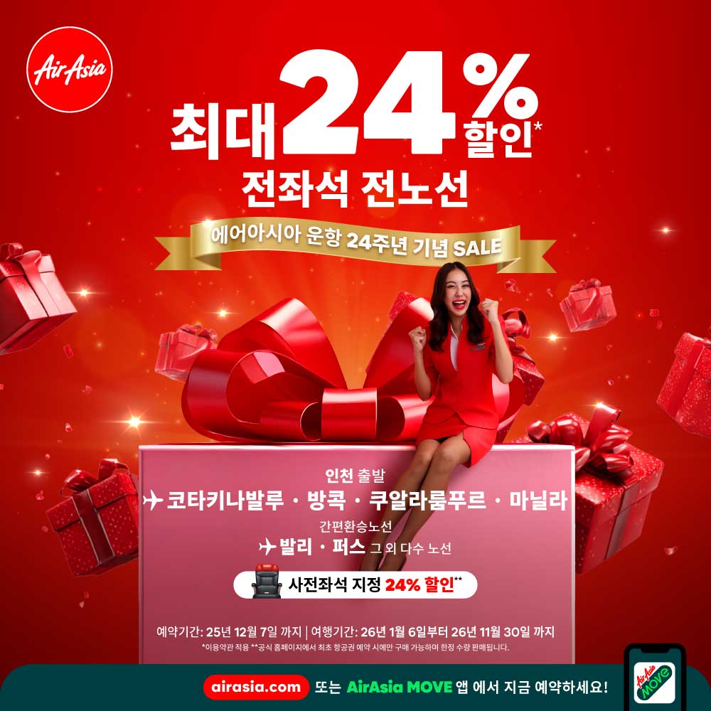 에어아시아(airasia)가 운항 24주년을 기념해 전 좌석, 전 노선에 적용되는 할인 프로모션을 선보인다. 이번 프로모션은 자사 공식 홈페이지(airasia.com) 및 에어아시아 무브(AirAsia MOVE) 앱에서 에어아시아 회원에 한해 적용되는 전용 할인 혜택이다.