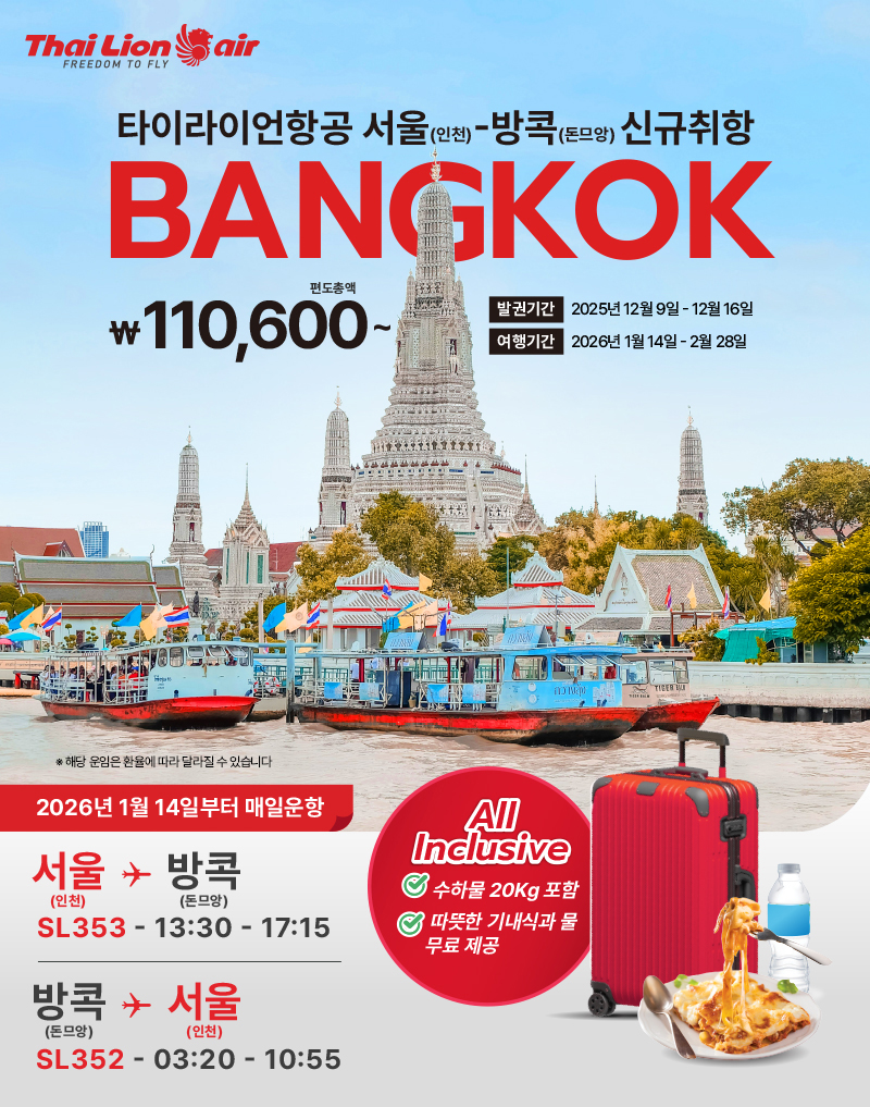 타이라이언항공(Thai Lion Air) 이 2026년 1월 14일 서울(인천)–방콕(돈므앙) 노선에 첫 취항한다.