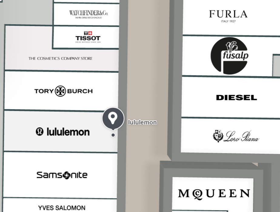 룰루레몬 매장은 샘소나이트(Samsonite)와 토리버치(Tory Burch) 매장 사이에 위치해 있습니다.