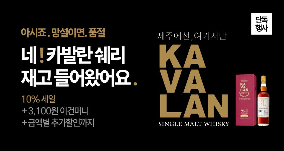 싱글몰트위스키 카발란 제품은 제주관광공사 면세점 독점으로 판매하고 있으며, 위스키 마니아들에게 인기 있는 카발란 쉐리(KAVALAN SOLIST Sherry) 계속 품절로 구매가 힘들었는데 이번에 제주관광공사 온라인면세점에 재입고되었습니다.