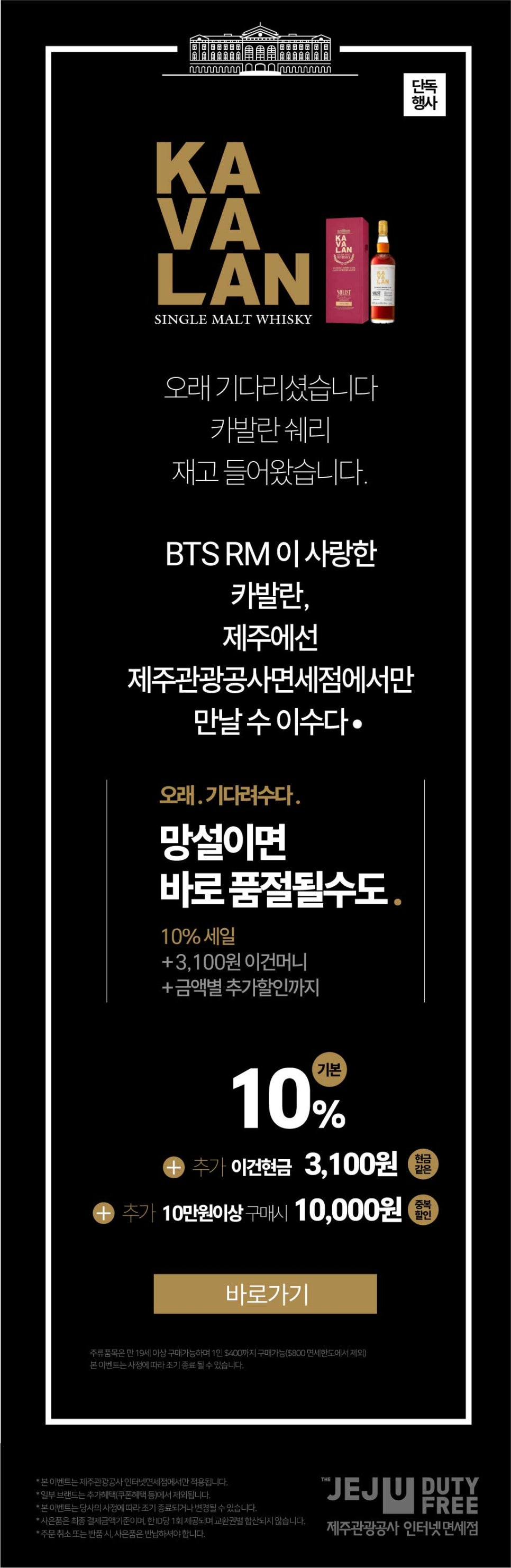 [트래블맵] 제주관광공사 온라인면세점, 위스키 카발란 쉐리 재입고 10% 할인 프로모션