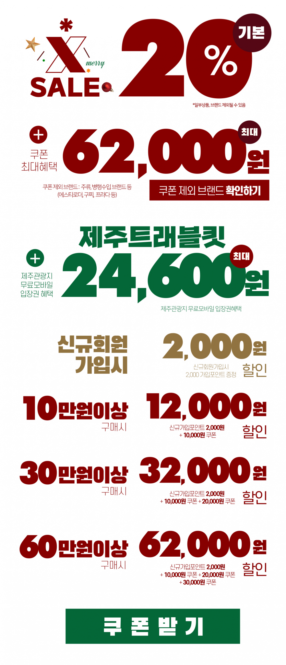 X-SALE 크리스마스 기본 할인 20% + 최대 62,000원 추가할인쿠폰