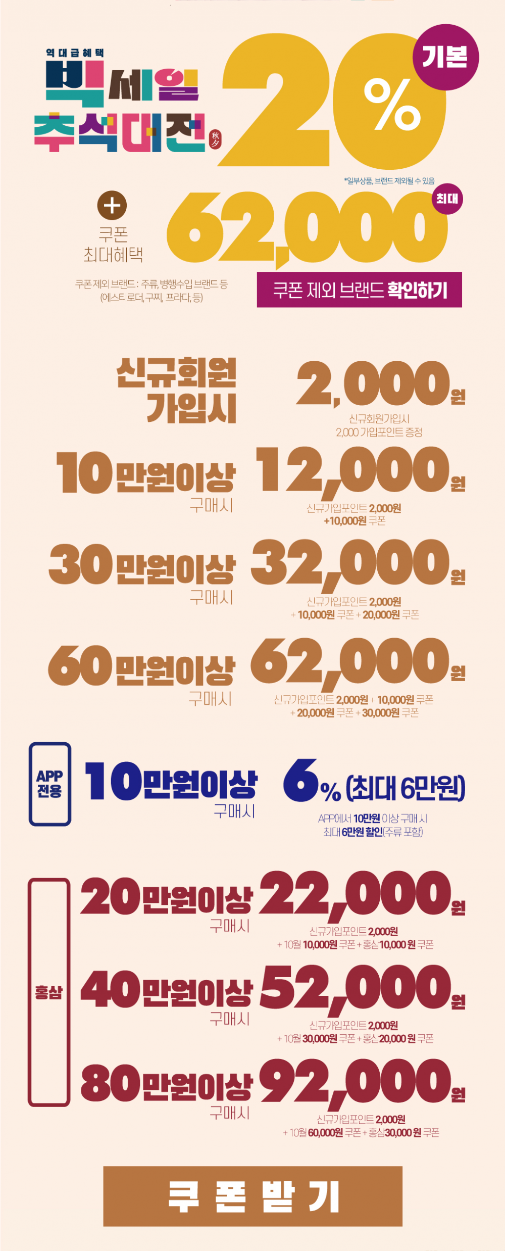 10월 빅세일 추석대전 할인 20% + 최대 62,000원 추가할인쿠폰