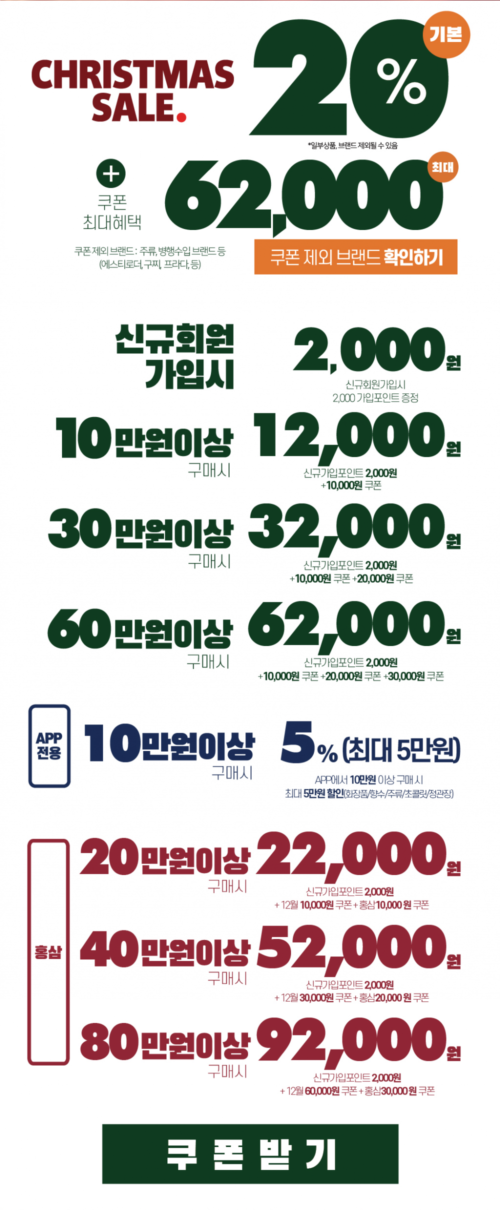 12월 크리스마스 세일 할인 20% + 최대 62,000원 추가할인쿠폰