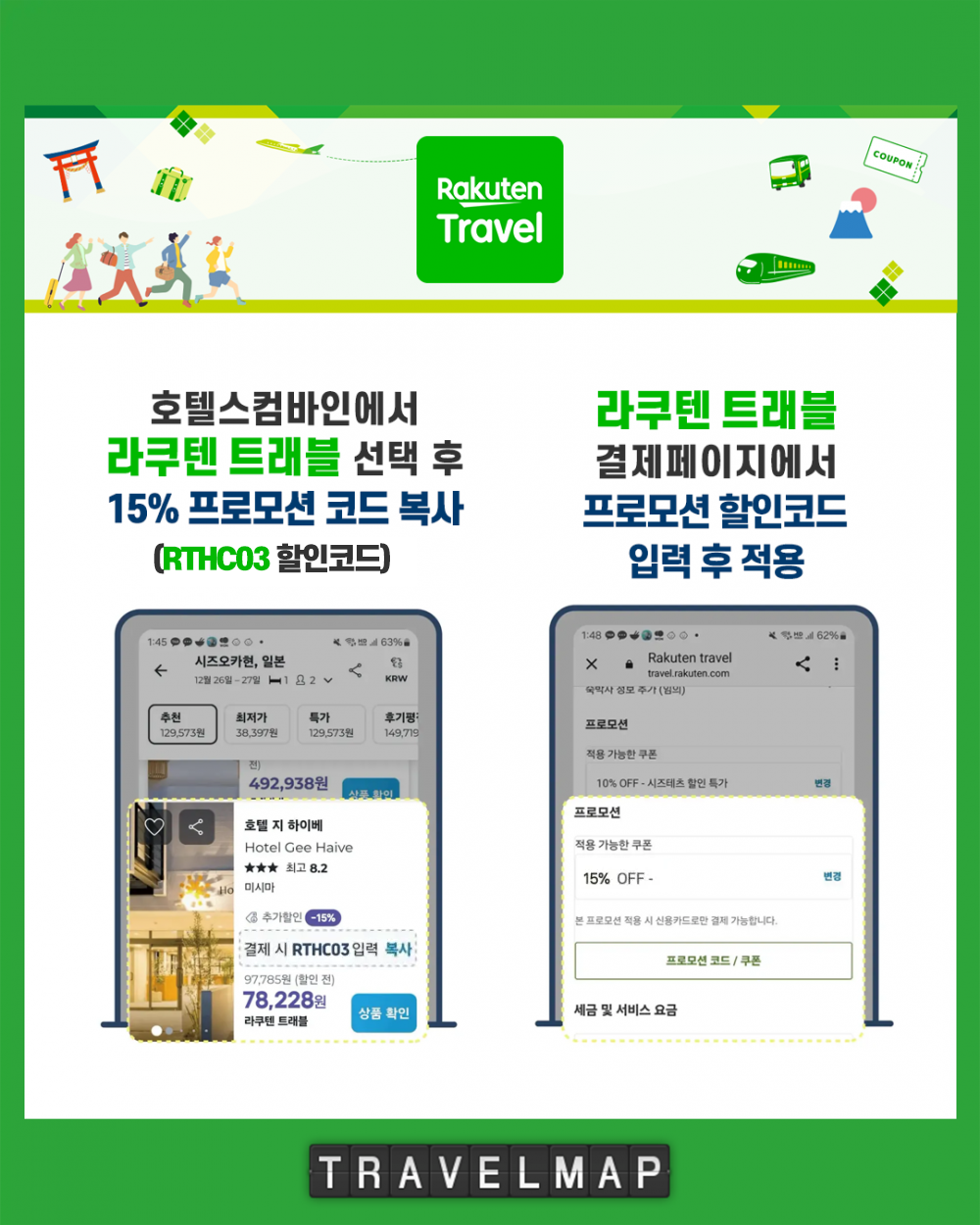 일본 최대 호텔 예약 사이트 라쿠텐 트래블 (Rakuten Travel) X 호텔스컴바인 단독 15% 할인 프로모션 입니다.