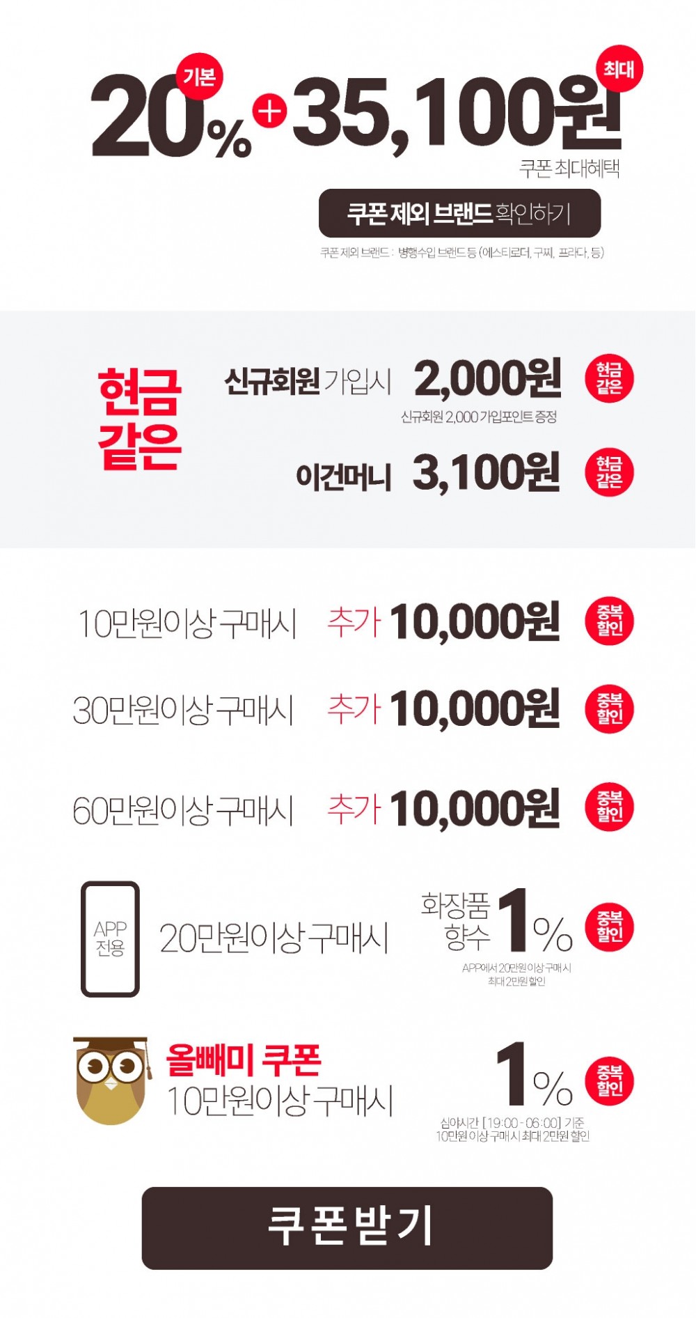 올빼미쿠폰 10만원 이상 구매 시 최대 1% 추가할인