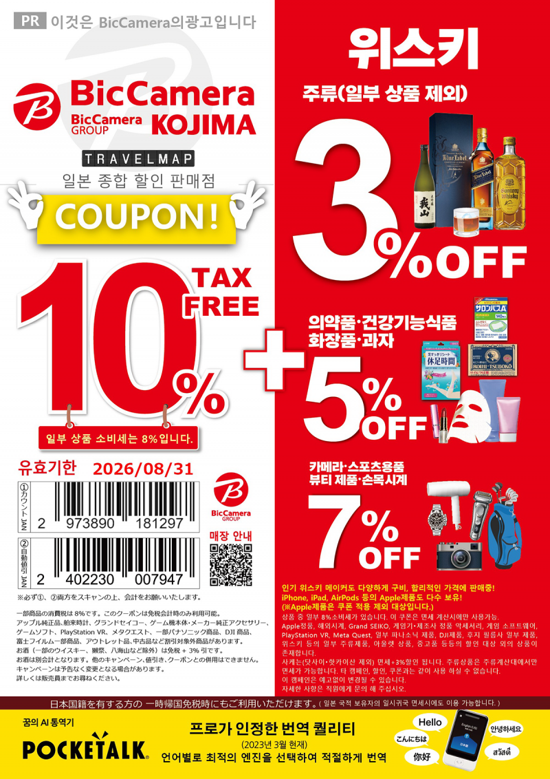 또한, 빅카메라(BIC CAMERA) 할인쿠폰은 빅카메라, 코지마, 소프트맵 전 지점에서 사용 가능 합니다.