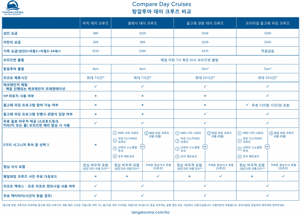 돌핀 관람 크루즈, 비치 데이 크루즈 등 새들이 지저귀며 돌고래들이 파도를 넘나드는 이곳에서 마음껏 자연을 만끽하고 탕갈루마 리조트(Tangalooma Island Resort) 서 진행되는 다양한 액티비티를 즐기실 수 있습니다.