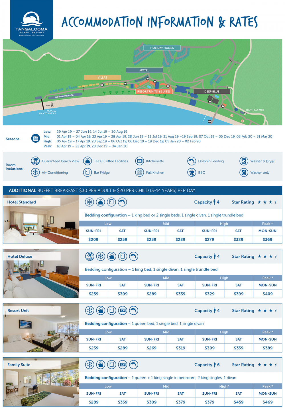 또한, 탕갈루마 리조트(Tangalooma Island Resort) 내 다양한 종류의 숙박시설이 마련되어 있습니다.