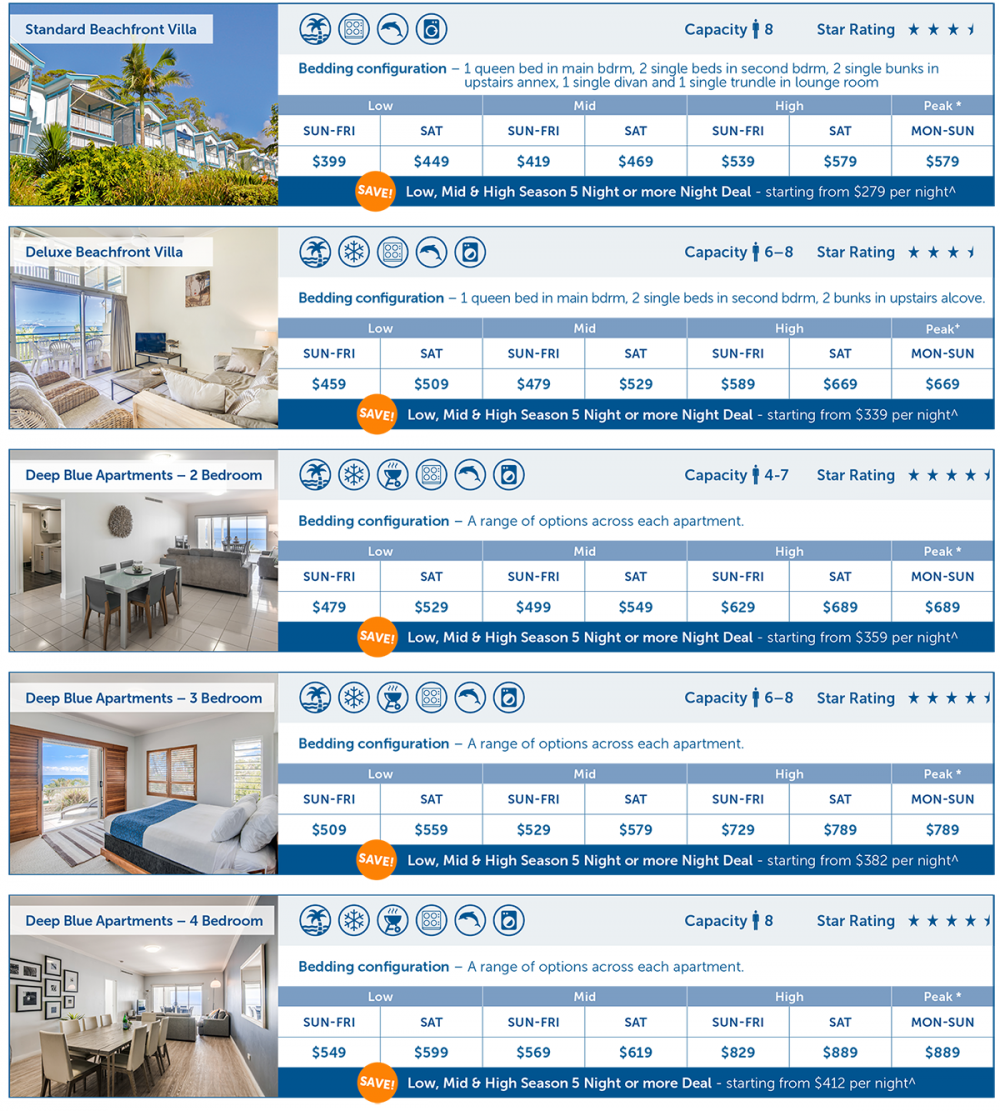해변과 가장 가까운 원룸스타일로 간단한 취사시설이 구비 리조트 유닛, 침실과 거실 및 주방을 분리하여 쾌적하고 편안한 시간을 즐길 수 있는 패밀리 스위트, 두 개의 침실 및 욕실, 발코니가 있어 여유로운 공간을 제공하는 비치 프런트 빌라, 모던한 라이프 스타일을 반영한 현대적 감각의 럭셔리한 아파트 스타일 딥 블루 아파트먼트 등 해변을 따라 마련된 대부분의 객실은 자연과 어우러진 조경과 푸른 바다의 전망을 갖추고 있습니다.
