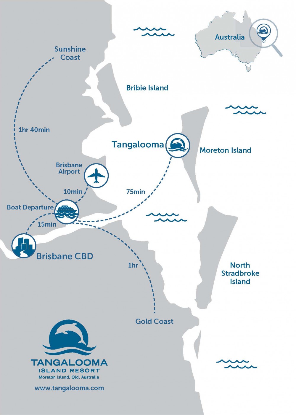 탕갈루마 리조트(Tangalooma Island Resort) 찾아오시는 방법은 호주 퀸즐랜드주의 중심도시인 브리즈번에서 약 75분 정도 여유롭게 모턴 베이의 파란 물결을 페리로 가로지르다 보면 어느새 탕갈루마 리조트에 도착하시게 됩니다.